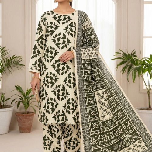 Embrace effortless elegance with our Bana Dora 3-Piece Lawn Suite. Designed for the modern woman who values tradition and comfort, this ensemble features a striking interplay of organic patterns and geometric precision in a refreshing forest green and cream palette.